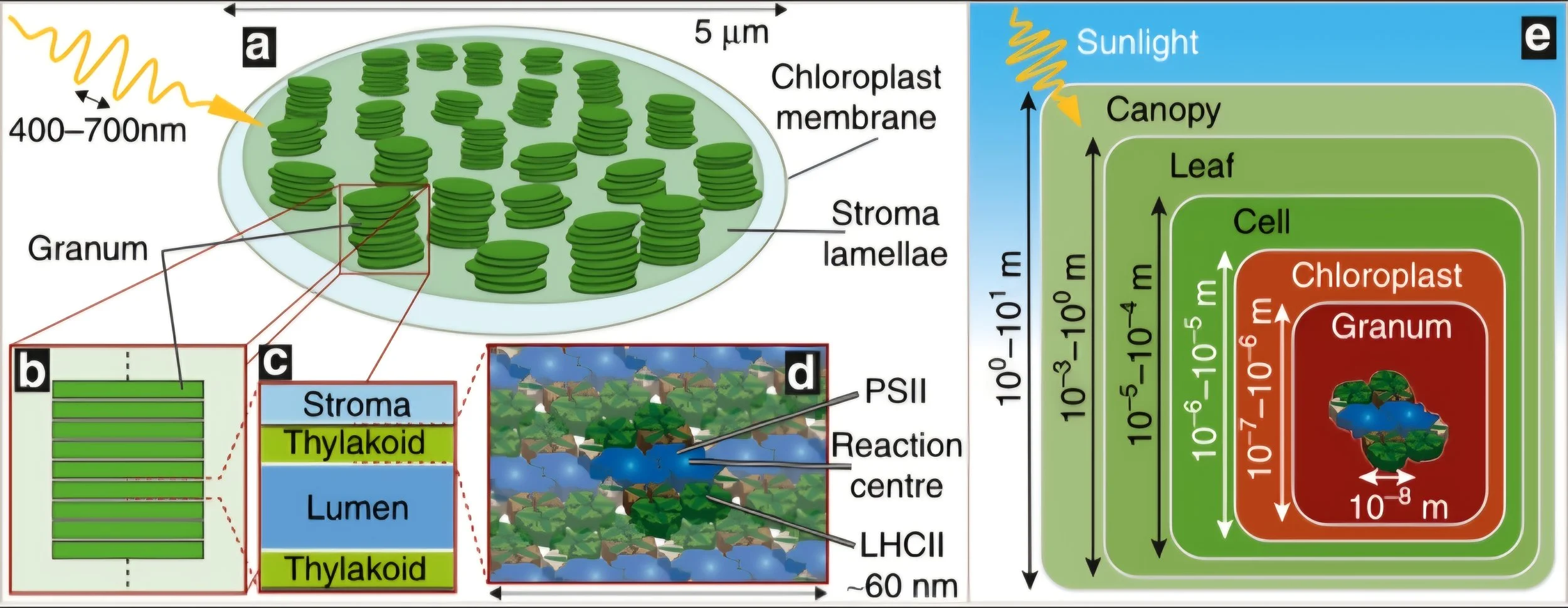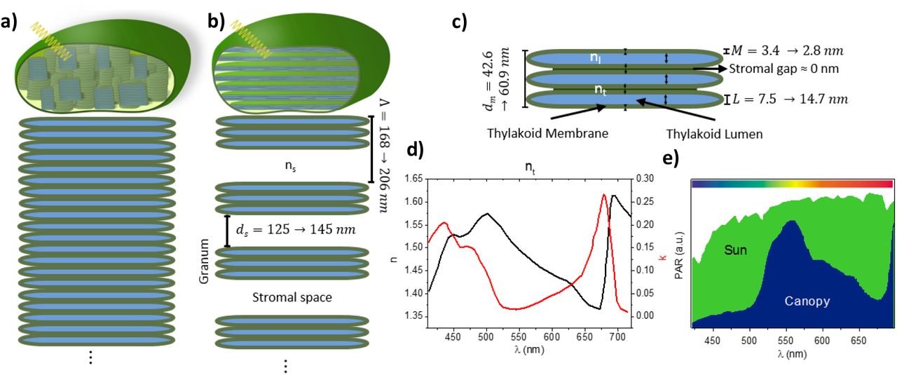 The layered thylakoid structure can effectively slow down and scatter the predominantly green photons that penetrate to the understorey, increasing their interaction time with photosynthetic pigments. This improves capture of wavelengths that ordinary chloroplasts inefficiently absorb [3].