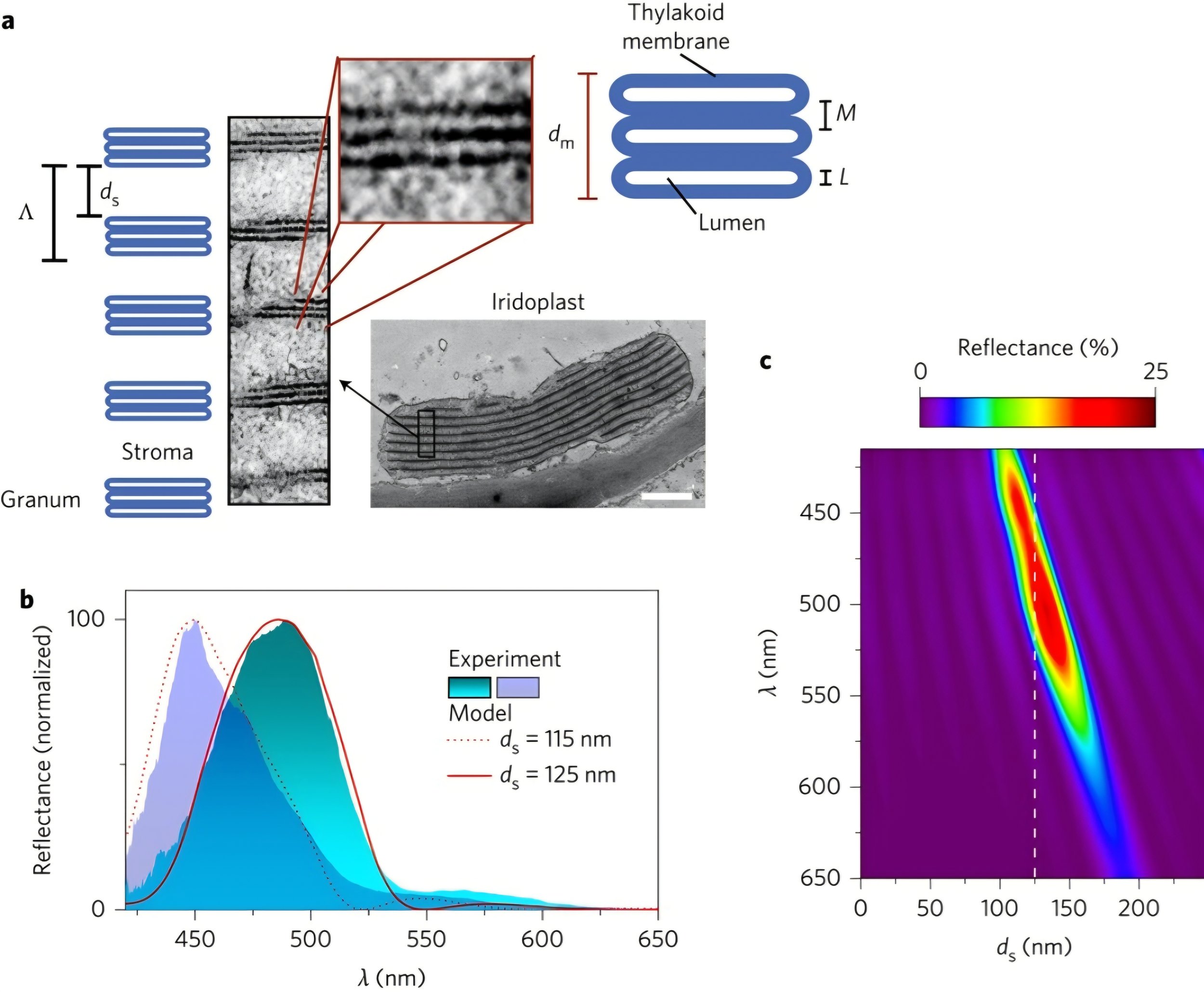 Photonic layers in the iridoplast reflect specific wavelengths via constructive interference.
