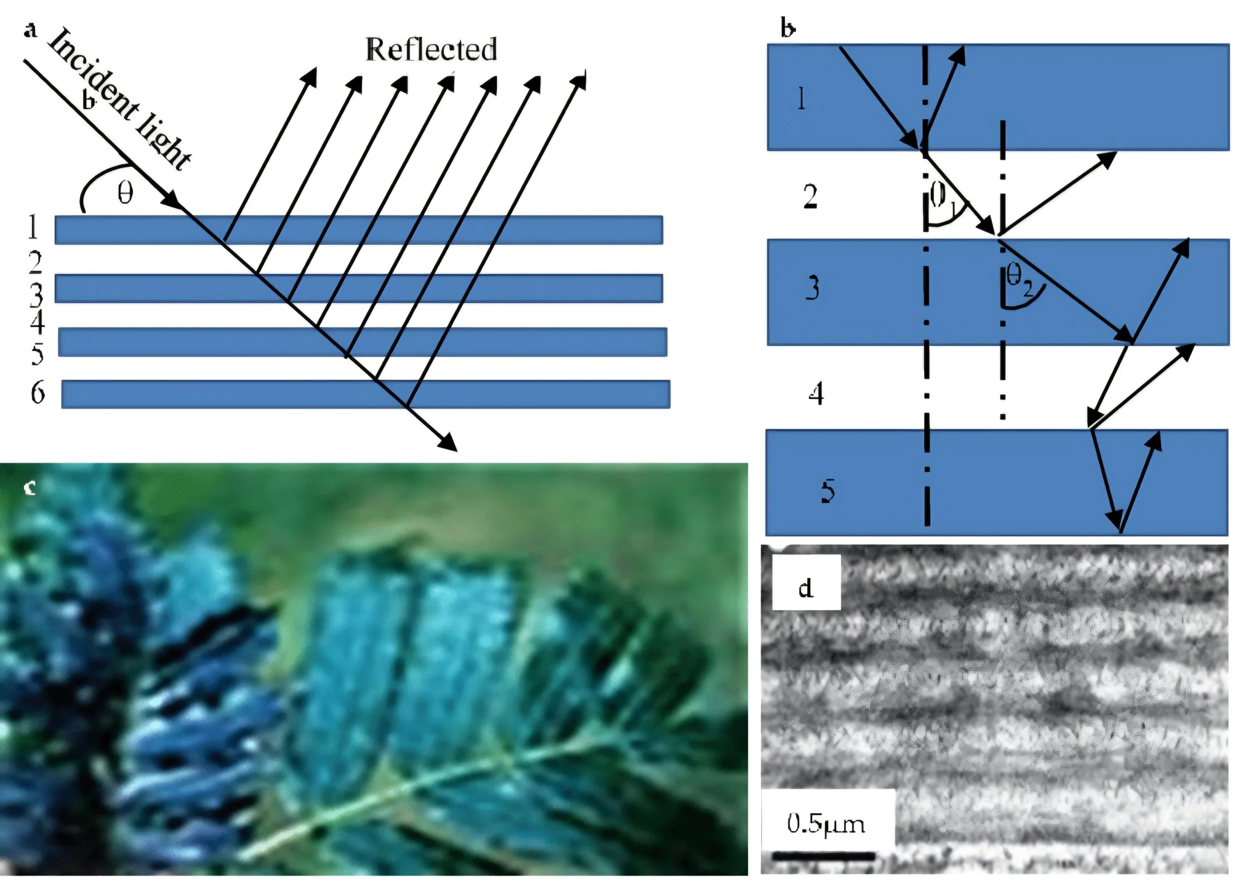 These layers act as a photonic crystal, reflecting specific wavelengths of light (often blue/blue-green) - the basis of iridescence.