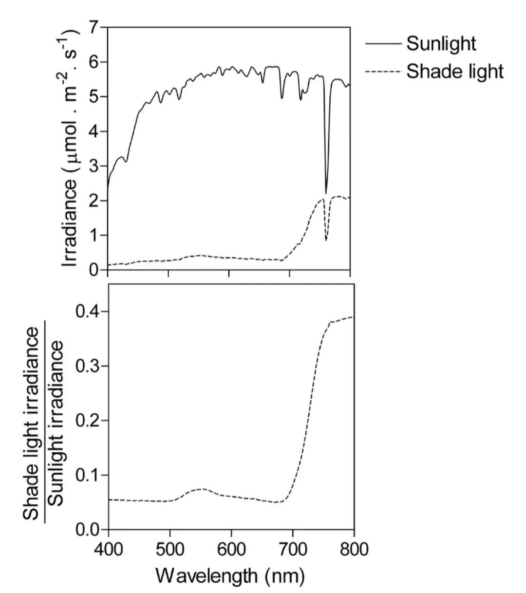 These diagrams show how spectral quality and intensity differ between shade and full sun.