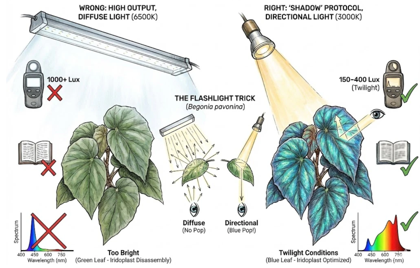 For horticultural enthusiasts wishing to cultivate begonias with strong iridescent character, environmental conditions play a crucial role. Unlike pigment traits genetically determined and stable, the iridoplast architecture depends on light environment cues.