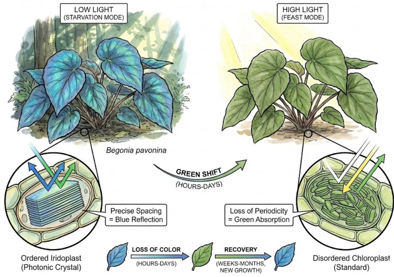 Begonia pavonina - the classic “peacock begonia” has been a focal model for iridoplast research due to its striking blue iridescent leaves and clear adaptive responses to low light.