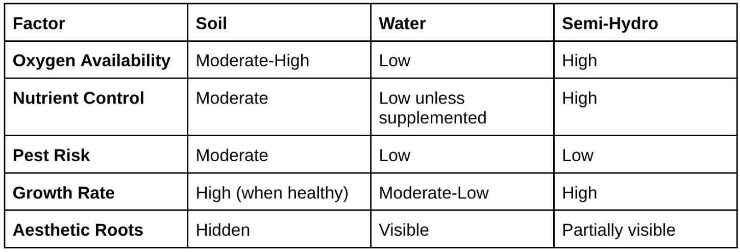Roots need oxygen to respire. In soil, air pockets provide oxygen between watering cycles. In water, oxygen is dissolved - and in much lower concentrations. This creates several challenges: