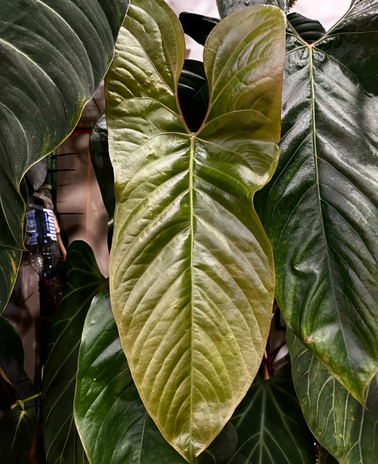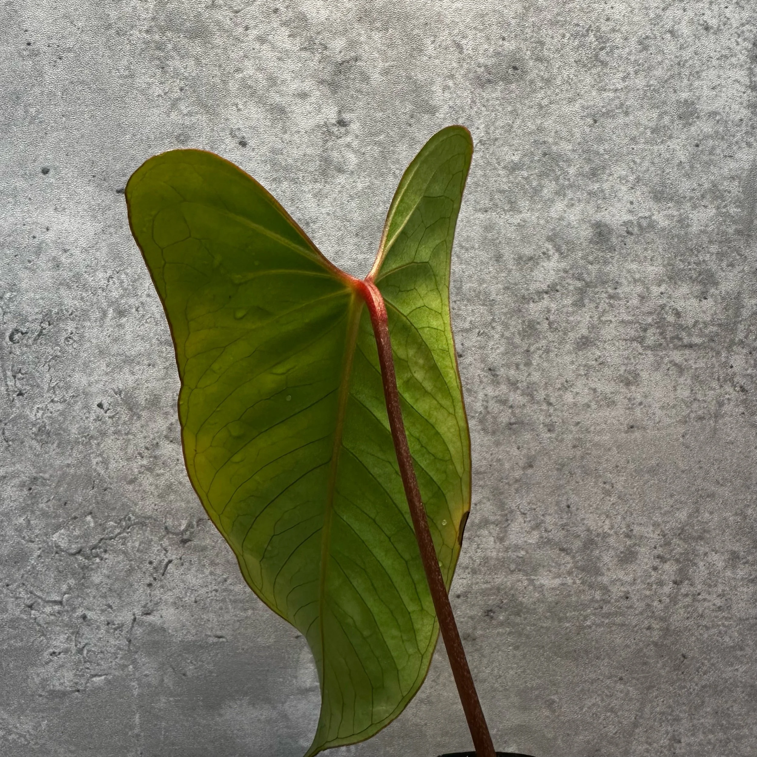 A mysterious large growing Anthurium that has coriaceous foliage which emerges with a stunning bronze colour. Hardening off to a deep green whilst retaining the red sinus, petiole plexus as well as the entire margin of the blade. This is a unidendrified Anthurium from the J&S Collection.