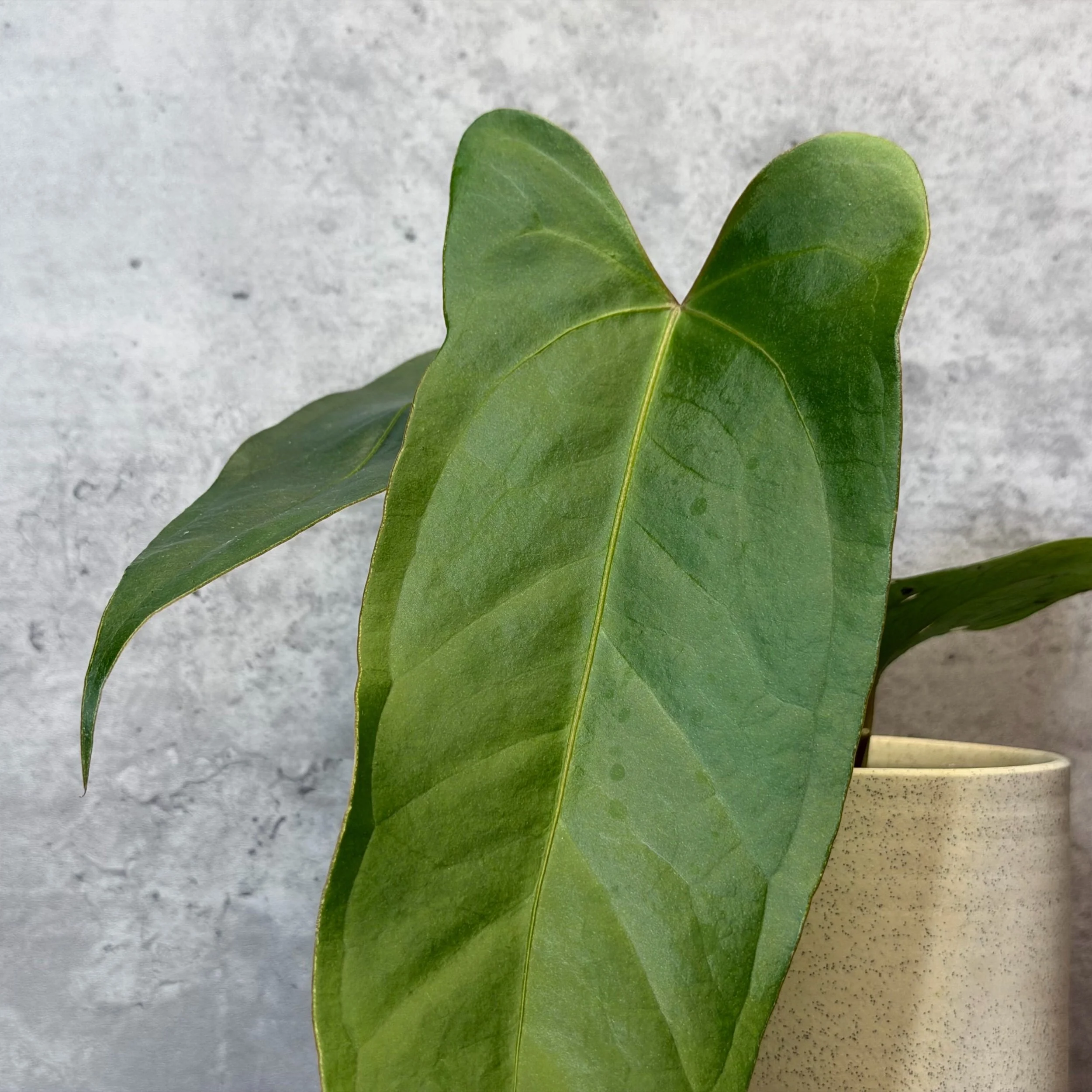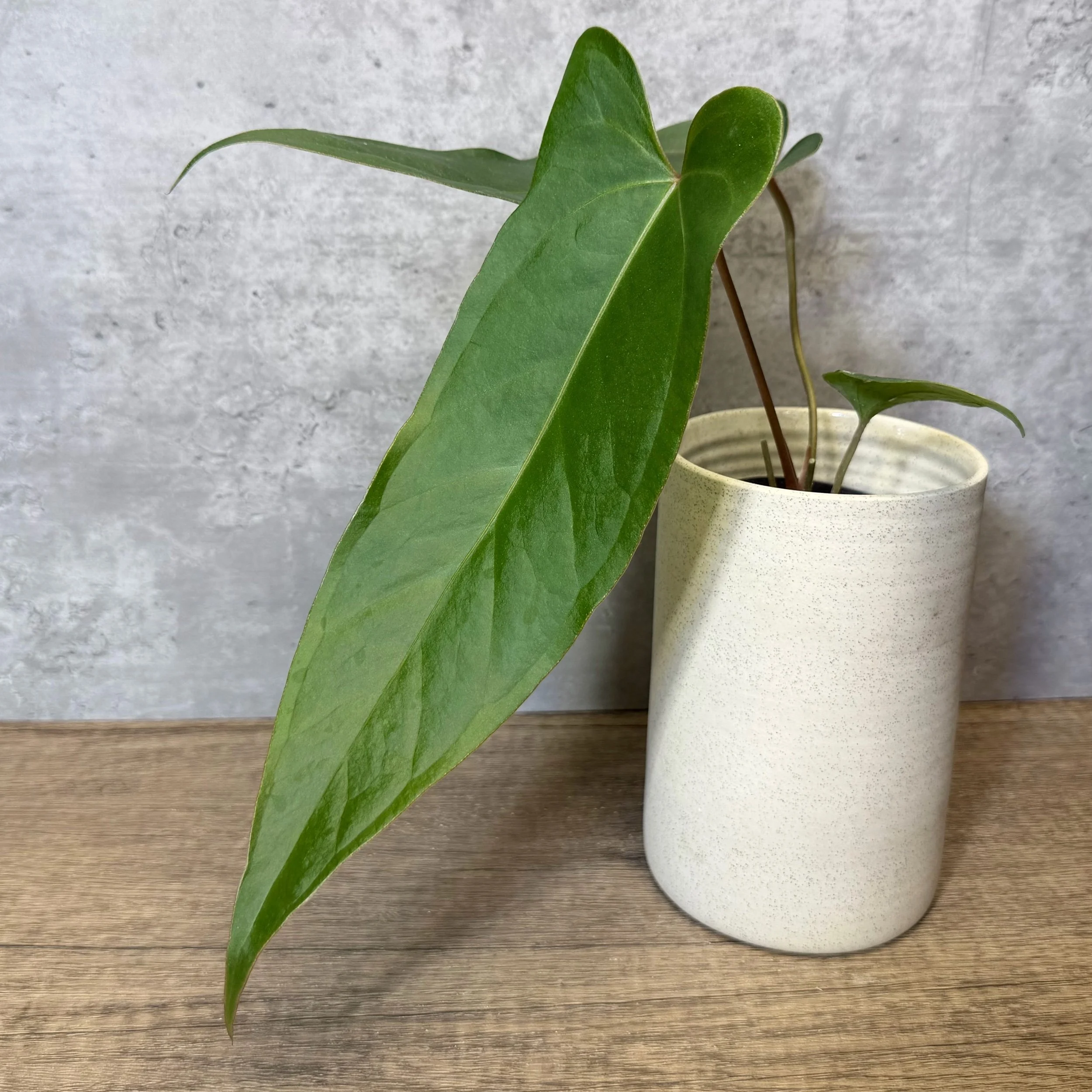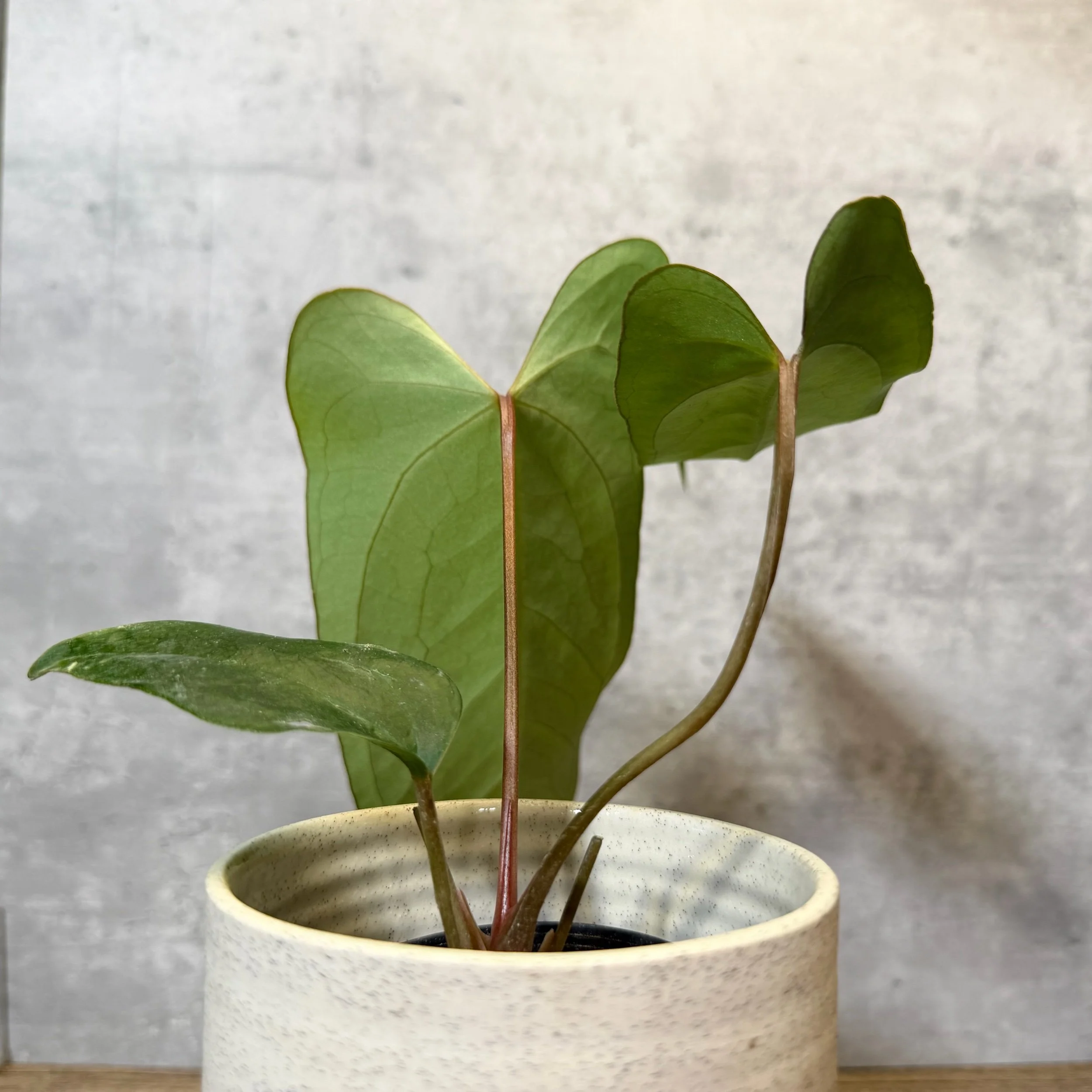 A mysterious large growing Anthurium that has coriaceous foliage which emerges with a stunning bronze colour. Hardening off to a deep green whilst retaining the red sinus, petiole plexus as well as the entire margin of the blade. This is a unidendrified Anthurium from the J&S Collection.