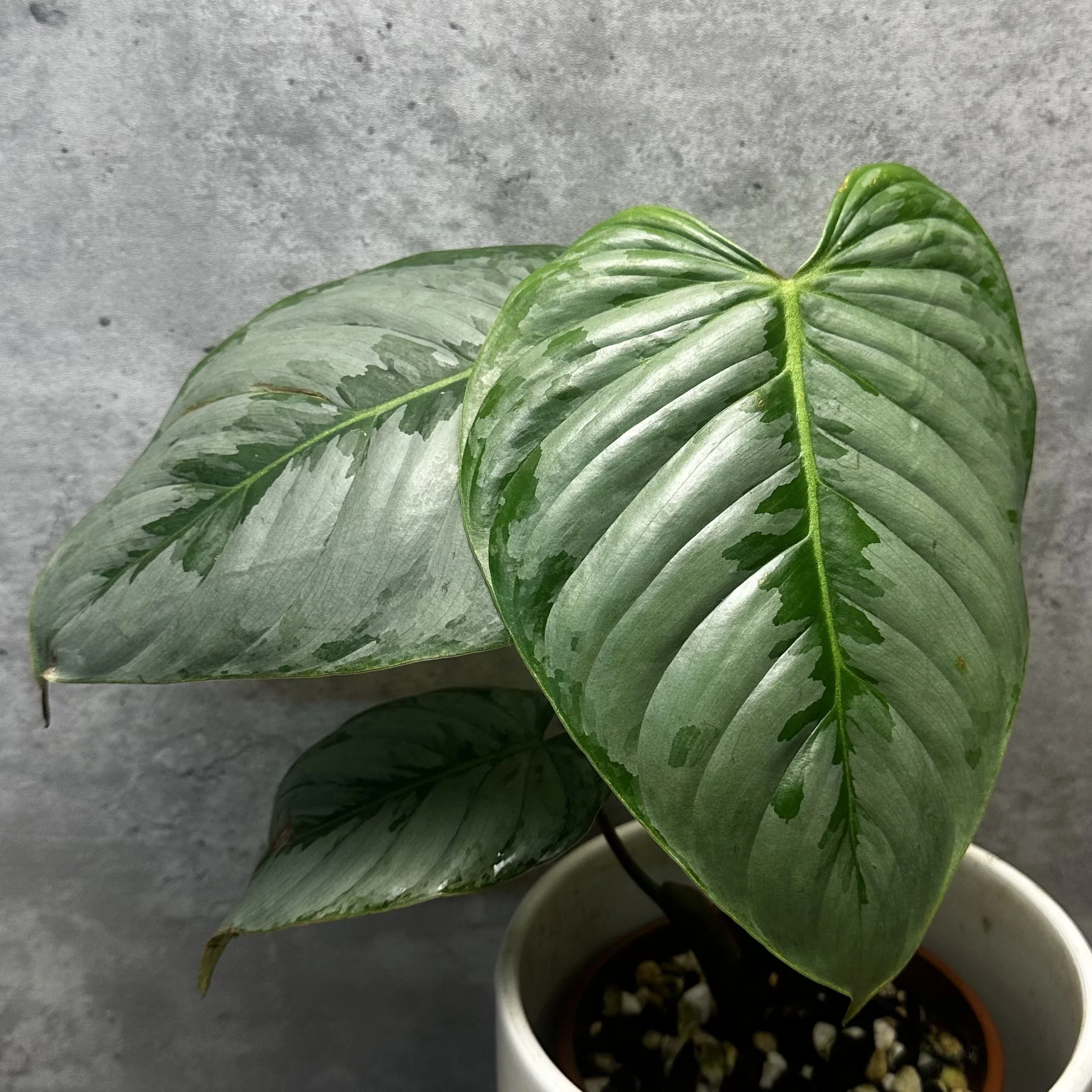 Philodendron sodiroi — A climbing species from Ecuador distinguished by its ovate to heart-shaped foliage adorned with silvery mottling across a deep green lamina. Exhibits a slender, scandent growth habit with notable petiole channeling and moderate internodal spacing. Adapted to humid, filtered-light rainforest environments, it benefits from vertical support and well-draining, organic substrates to enhance leaf size and reflective variegation. Highly valued among collectors for its metallic sheen and refined texture.