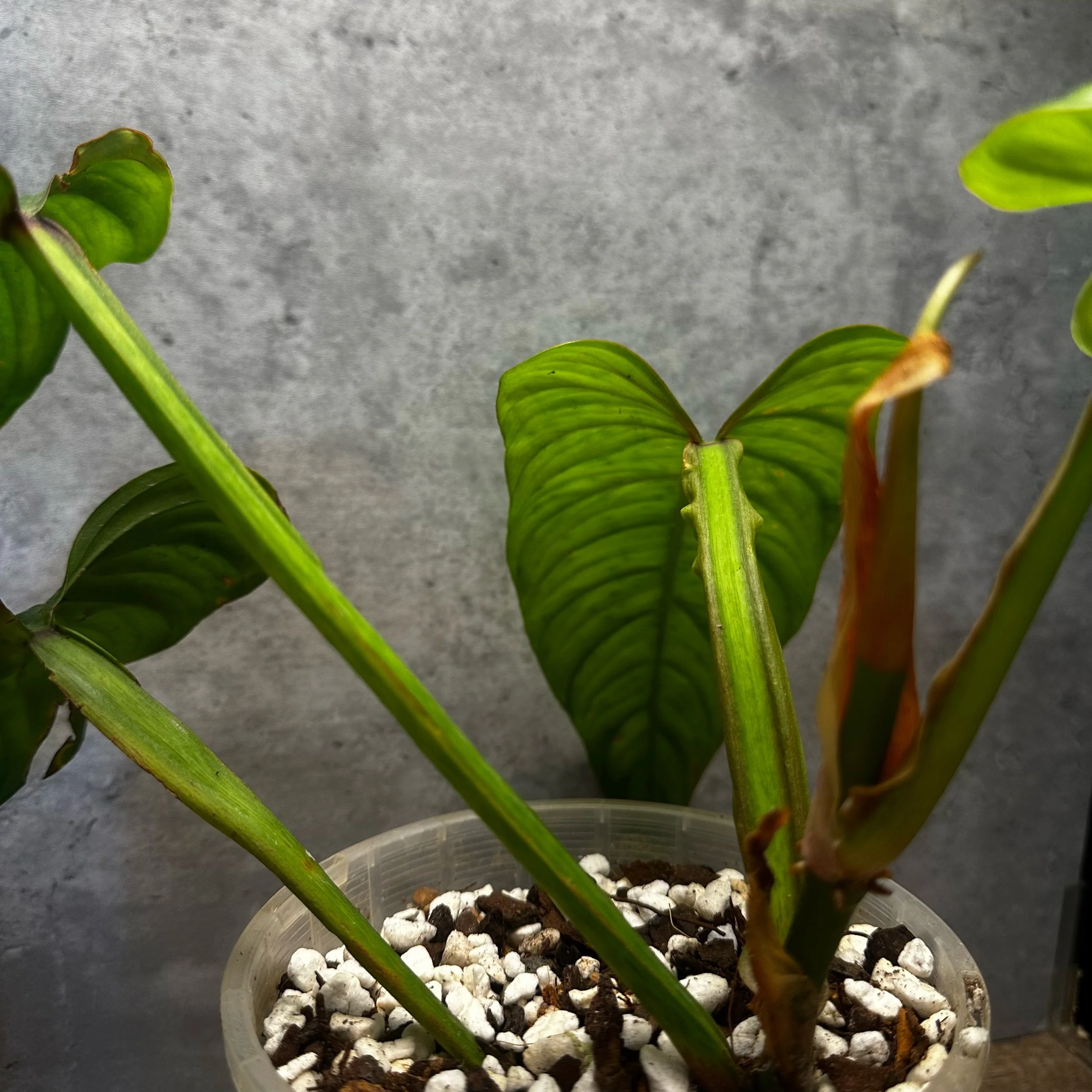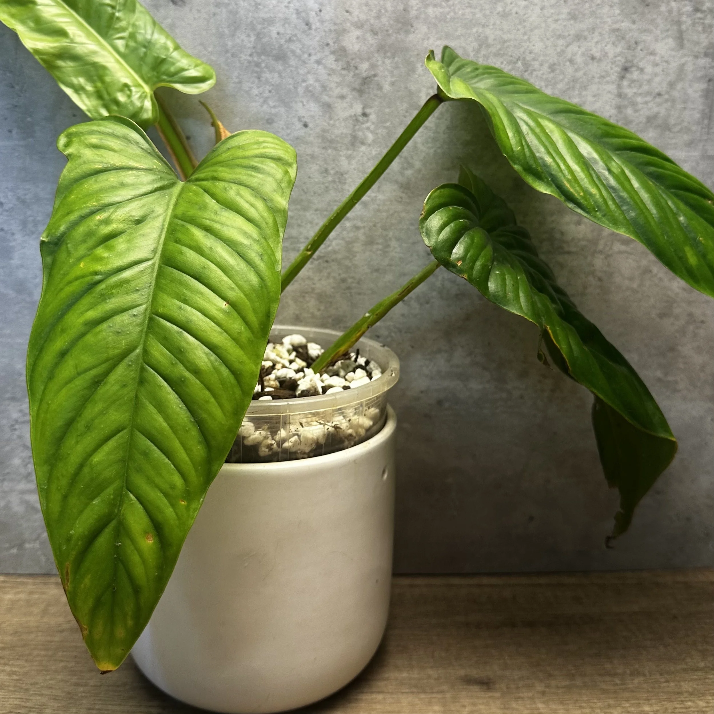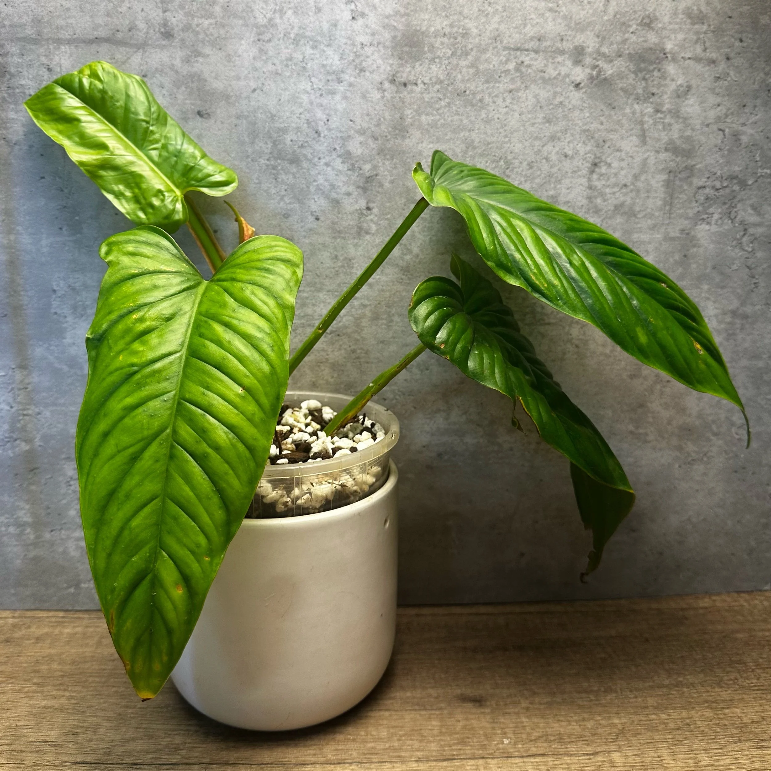 Philodendron ernestii is a rare, climbing aroid native to the tropical rainforests of South America, distinguished by its prominently corrugated, lanceolate foliage and sturdy, elongated petioles with a characteristic winged profile. As a hemiepiphytic species, it thrives when provided with vertical support, developing more defined venation and larger leaf blades as it ascends. Adapted to humid understory environments, P. ernestii prefers well-aerated substrates, moderate to high humidity, and filtered light for optimal growth. A sought-after collector plant, it offers a visually striking textural element suitable for advanced aroid enthusiasts and botanical collections.