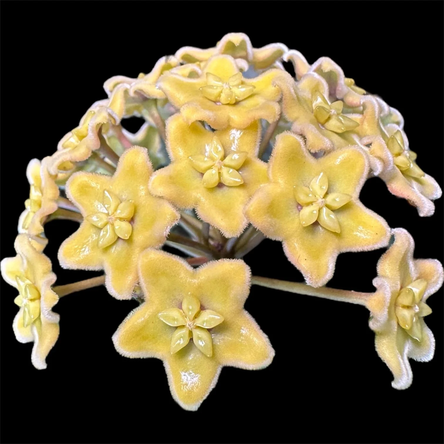 This species is very similar to H. flagellata in both foliage and blooms. Displaying thin, narrow leaves that have a satin finish, this Hoya makes a stunning houseplant as it tangles its way out of the pot. Slow to begin but once it takes off this species blooms frequently. Blooms are beautiful with delicate hairs protruding from the corolla similar to H. caudata, flagellata. With a pale yellow/gold corolla the purple corona contrast nicely. This species is best kept slightly moist.