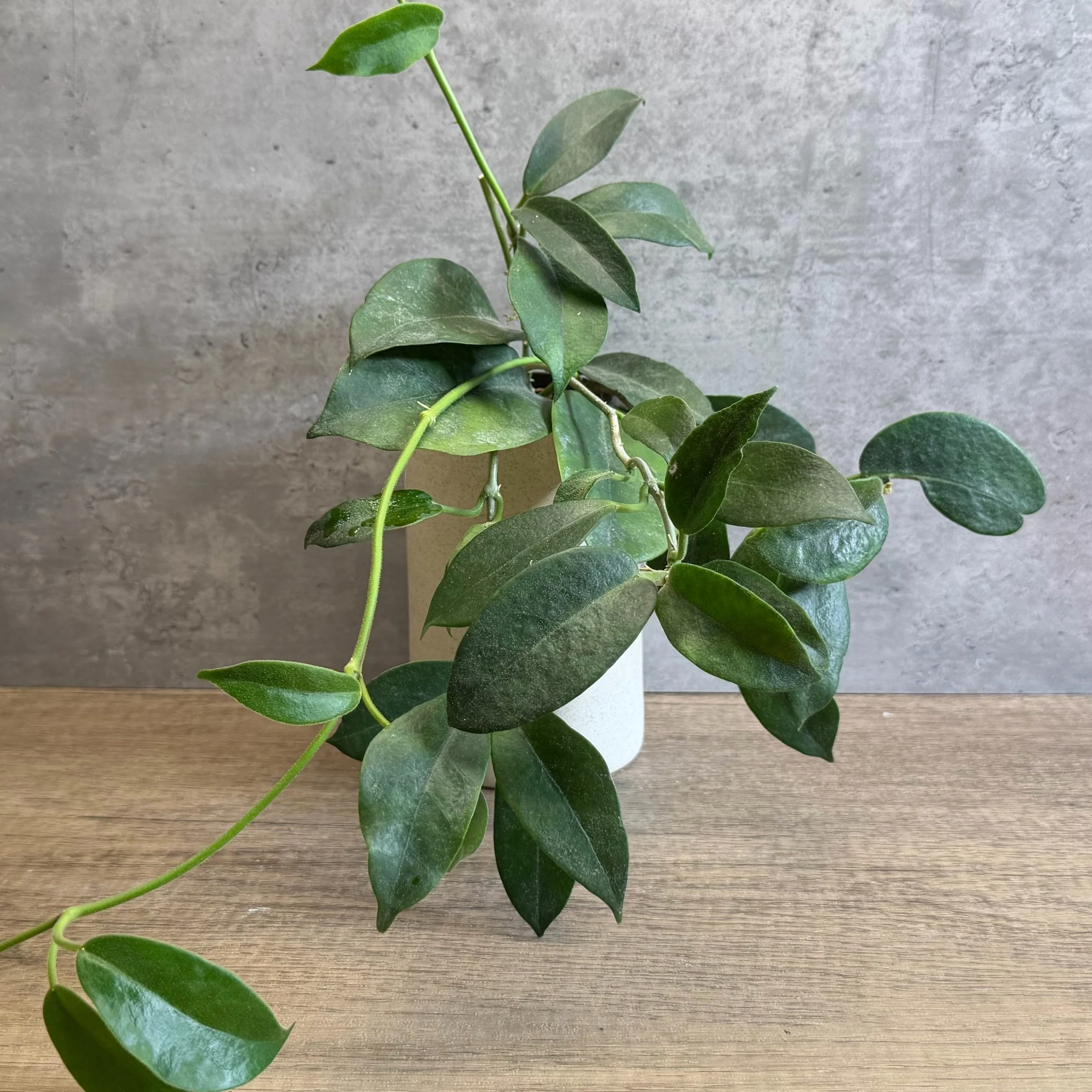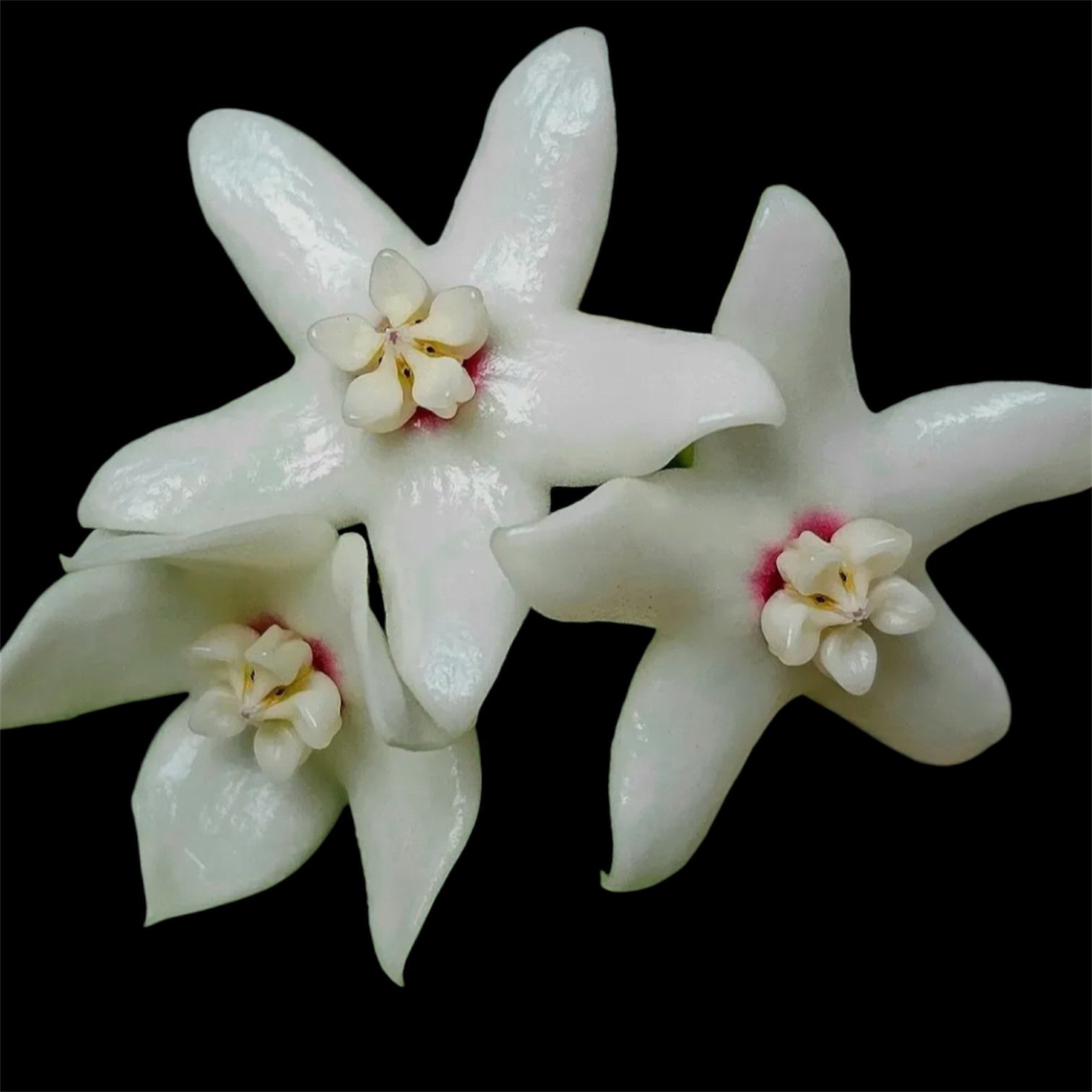 This species is another one for the lovers of the fuzz. The foliage is quite pubescent with a thick, firm texture. Blooms are star shaped with a white corona and corolla, a subtle pink ring is present underneath the corona. Blooms are very fragrant. Under bright indirect light this species sunstresses a beautiful burgundy/red colour.
