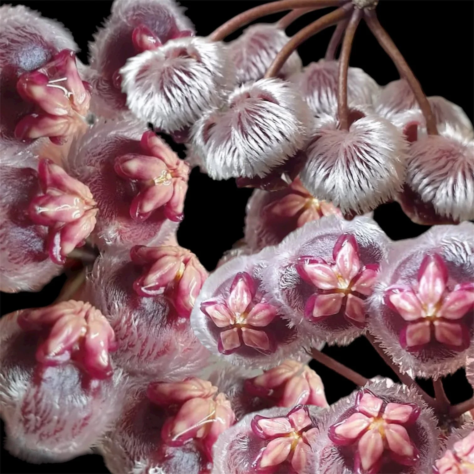 Hoya sulawesiana — a remarkable species endemic to Sulawesi, Indonesia, noted for its dense indumentum and striking floral morphology. Its thick, glossy leaves support umbels of deep pink to crimson flowers with strongly reflexed corollas, heavily covered in fine trichomes that give a velvety, iridescent appearance. Belonging to the Eriostemma section of Hoya, this species exemplifies adaptation to humid montane environments and is highly prized for its dramatic, tactile blooms and robust growth habit.