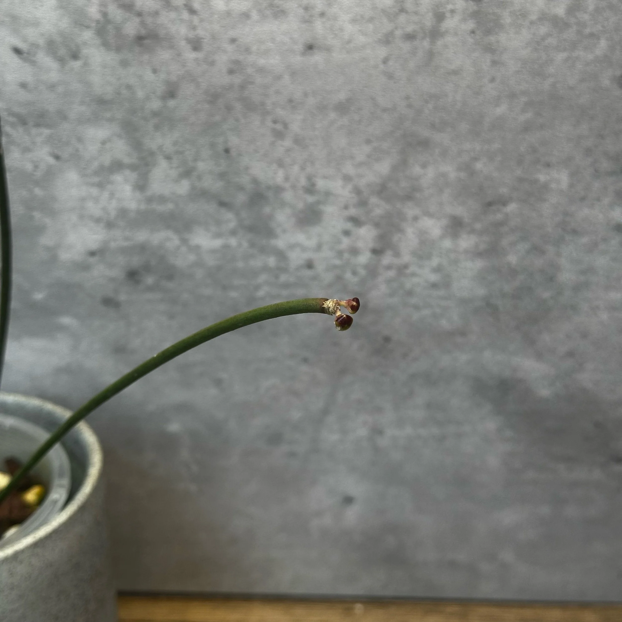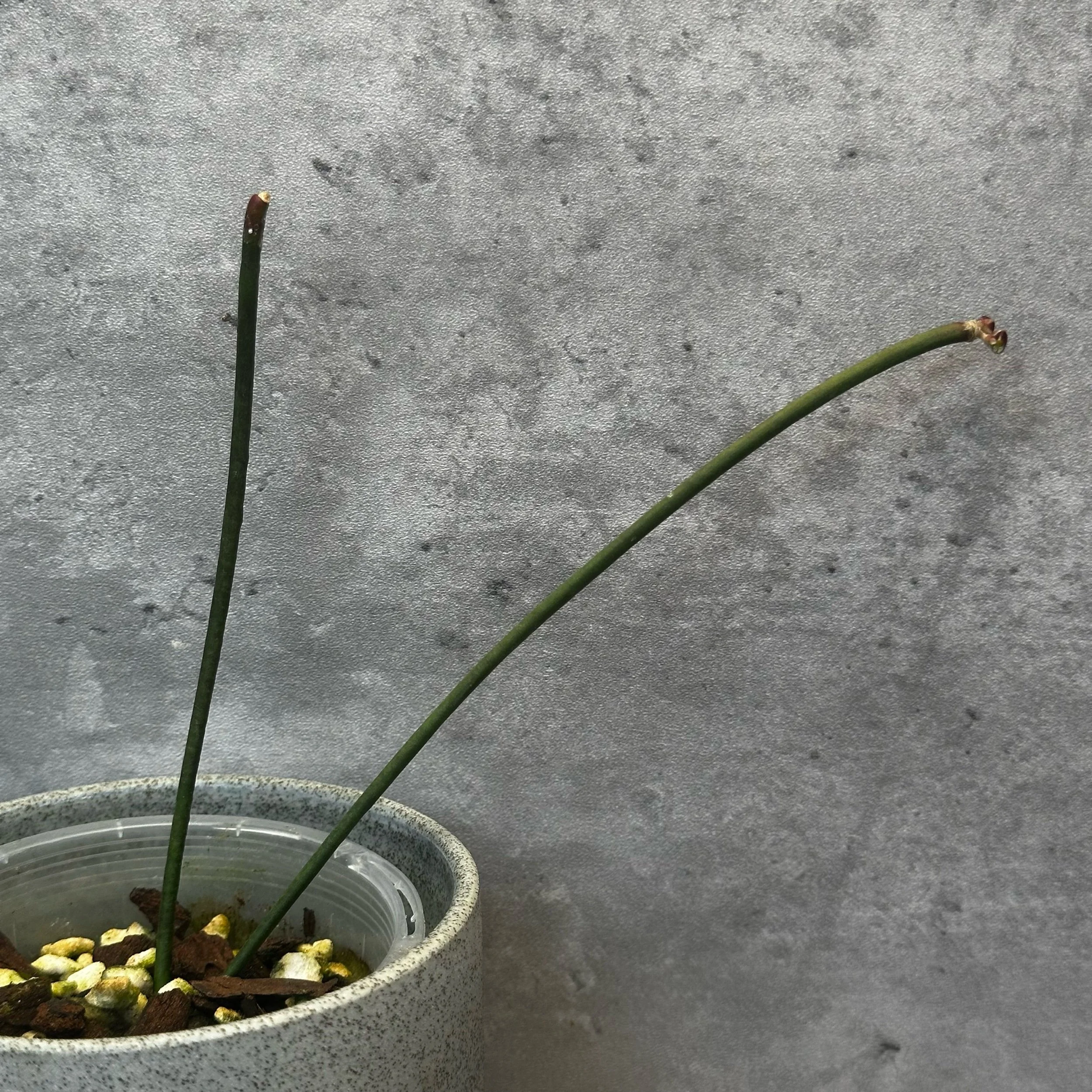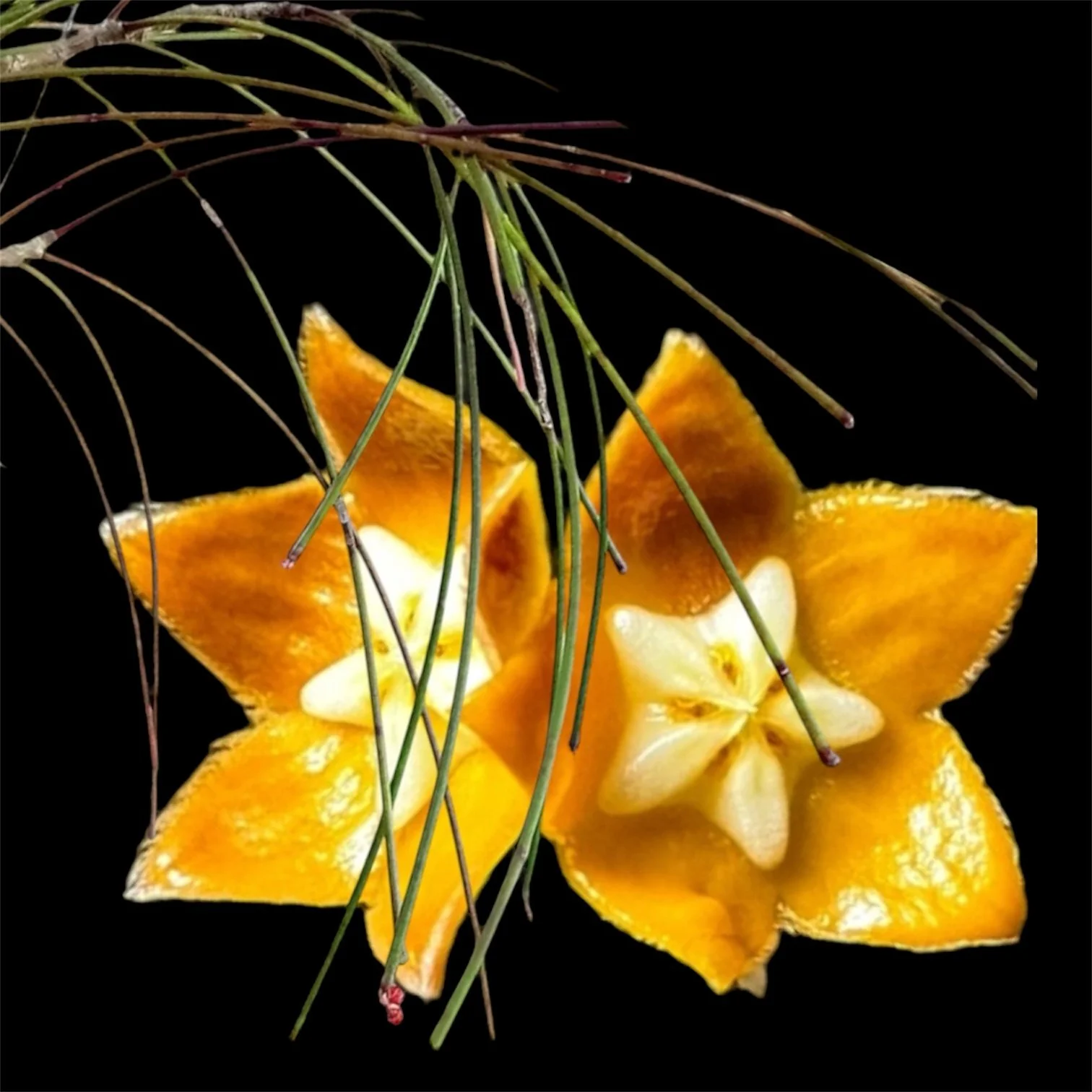 Hoya spartioides is a rare epiphytic species native to Southeast Asia, characterised by its terete, leafless stems adapted for efficient water storage. Growth is upright and clustered, forming a distinctive needle-like architecture. Umbels produce cream-coloured coronas atop a orange corolla with a mild fragrance, typically flowering under high light and stable humidity.